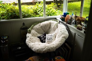 This intimate photograph captures a plush, oversized chair adorned with soft, inviting textures, set against a backdrop of vibrant greenery filtering through the windows. The gentle, natural light creates a warm and serene atmosphere, inviting the viewer to imagine a moment of relaxation and reflection in this cozy nook. Decorative items and a thought-provoking pillow enhance the charm, evoking a sense of comfort and connection to nature.