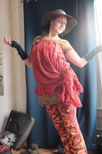 A vibrant, playful portrait of a woman showcasing an eclectic outfit, highlighted by a striking red garment and mismatched leggings. The soft, natural light filters in through the window, creating a warm and inviting atmosphere, while the subject's confident pose adds a touch of whimsy. The background, with its blue curtains and scattered belongings, contrasts with the bold colors of her attire, enhancing the overall sense of spontaneity and creativity.