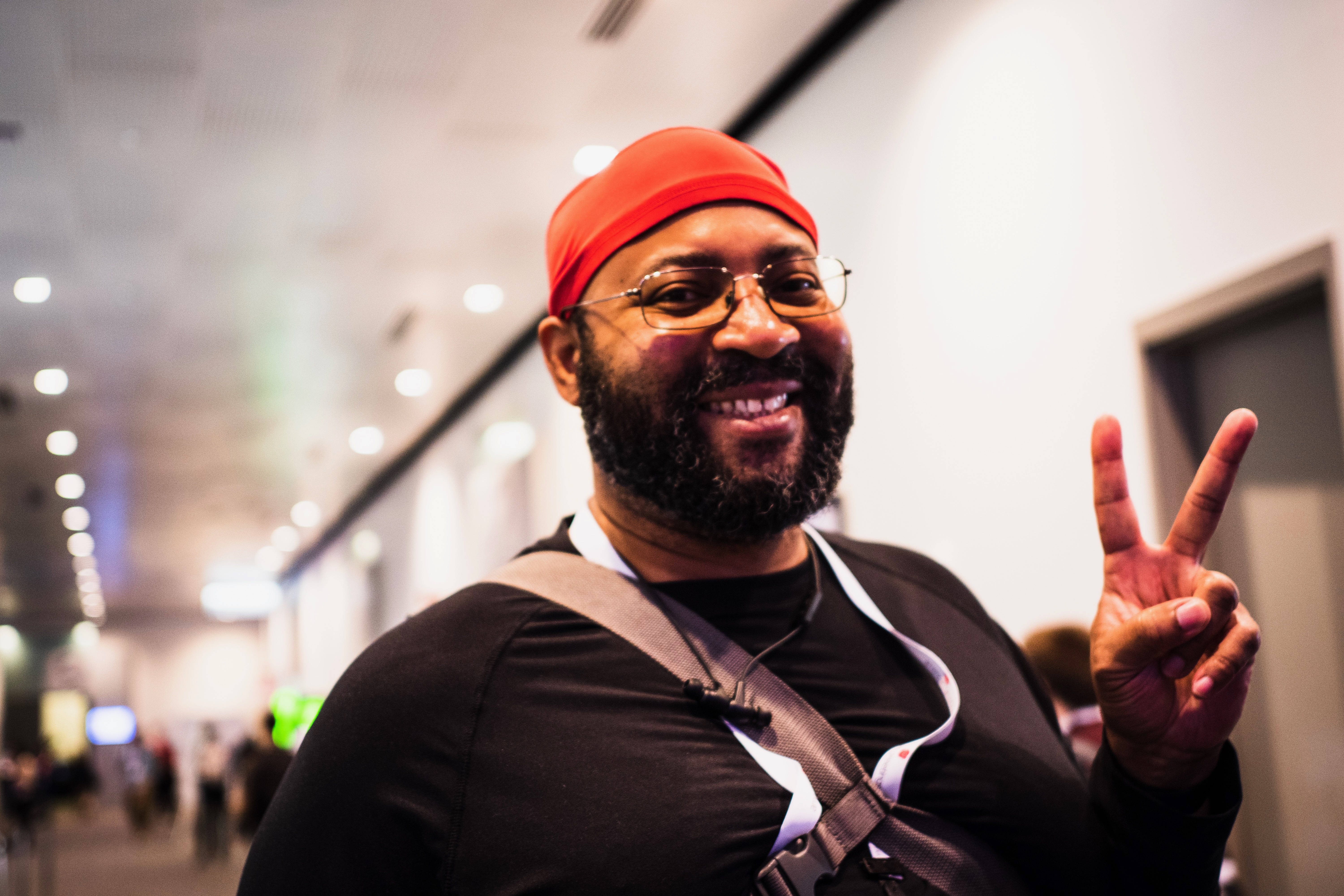 In a vibrant conference hallway, a man flashes a peace sign, exuding warmth and enthusiasm. The soft, diffused lighting enhances his inviting smile, while the blurred background suggests a bustling atmosphere full of life and connections. His bright red headband and casual attire contribute to a relaxed yet spirited mood, embodying the spirit of community and celebration.