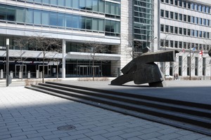 The photograph captures a sleek urban plaza dominated by a modern sculpture, which adds a striking contrast to the contemporary glass-and-concrete architecture. The scene is bathed in soft natural light, creating a calm yet dynamic atmosphere, while bare trees hint at early spring. The composition emphasizes the geometric lines and shadows, inviting viewers to reflect on the interplay between art and architecture in a bustling city.
