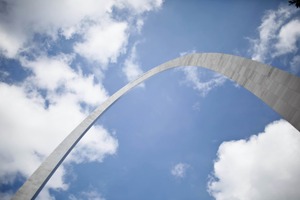 A striking upward view of a sleek, metallic arch under a vast blue sky, dotted with fluffy white clouds. The composition emphasizes the elegant curve of the structure, evoking a sense of aspiration and grandeur, while the bright lighting enhances its smooth surfaces. The mood is uplifting and expansive, inviting the viewer to gaze upward and ponder the limitless possibilities beyond.