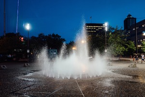 A lively fountain erupts in a playful display, its water illuminated by nearby lights under the dusky blue sky. The surrounding park adds a calm ambiance, with a few scattered figures enjoying the vibrant atmosphere. The composition captures a sense of joy and spontaneity, blending urban life with the refreshing allure of water.