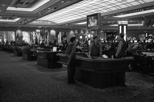 This black-and-white photograph captures the bustling atmosphere of a casino, where the interplay of light and shadow creates a moody, almost nostalgic ambiance. In the foreground, several croupiers engage with each other, while patrons populate the tables in the background, epitomizing the lively yet tense essence of gambling. The composition emphasizes the depth of the space, guiding the viewer's eye through the layered interactions within this vibrant setting.