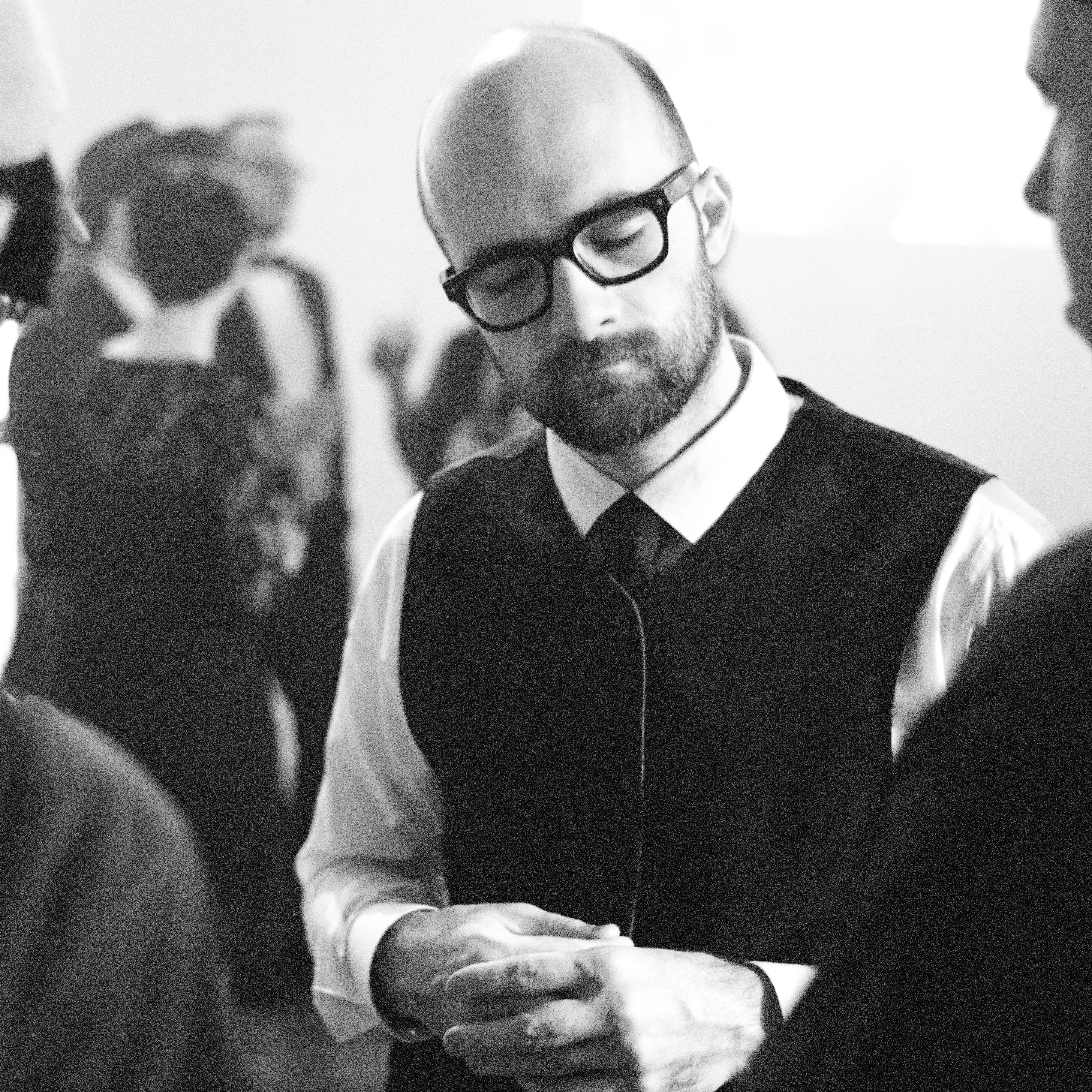 The photograph captures a man in formal attire, lost in thought amid a lively gathering. The soft lighting and monochromatic tones evoke a sense of nostalgia, highlighting his introspective mood against a blurred backdrop of mingling guests. His gesture of clasped hands adds a layer of sophistication and quiet reflection to the bustling scene around him.