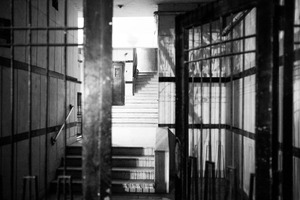 This photograph captures an abandoned stairwell, framed by a stark metal gate that suggests both confinement and mystery. The interplay of shadows and light creates an unsettling yet hauntingly beautiful atmosphere, inviting curiosity about the stories hidden within the space. The monochrome palette enhances the sense of desolation, evoking a mood of nostalgia and intrigue.