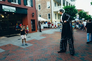 In the vibrant outdoor scene, a stilt walker dons an elaborate, dark costume, towering over the crowd with an air of whimsy. A captivated onlooker, dressed in casual attire, snaps a photo, encapsulating the lively atmosphere of a festival. The warm evening light bathes the scene, enhancing the cheerful energy of the gathering.