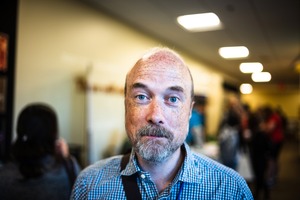 In this candid portrait, a man stands at the forefront, capturing attention with his piercing blue eyes and thoughtful expression. Soft, diffused lighting gently illuminates his face, while the softly blurred background hints at a bustling atmosphere, creating a juxtaposition of stillness and activity.