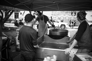 In a bustling outdoor setting, a dedicated cook stirs a large pot, exuding a sense of purpose and craftsmanship. The photograph captures a slice of life, framed by the shaded tent, with soft, diffused lighting enhancing the monochrome mood. Nearby, onlookers engage in conversations, adding to the communal atmosphere, while the composition highlights the dynamic interplay between the kitchen and its patrons.