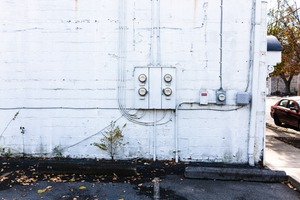 This photograph captures a stark, minimalist view of a white wall adorned with electrical meters and cables, creating a sense of industrial simplicity. A single resilient plant sprouts from the ground, contrasting with the urban backdrop, evoking feelings of hope and quiet resilience. The soft, natural light enhances the muted tones, highlighting both the texture of the wall and the subtleties of the scene.