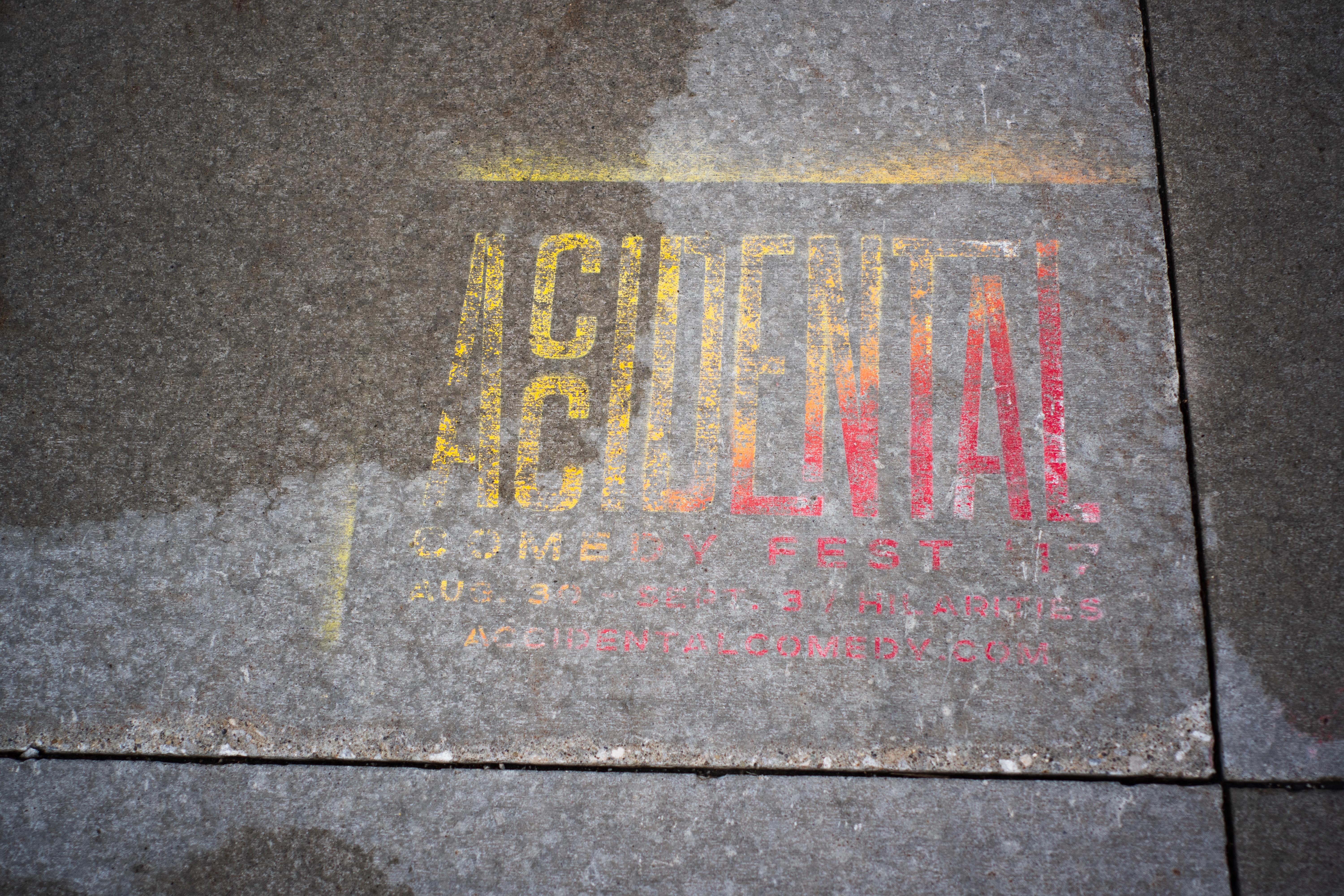 The photograph captures a vibrant announcement for the 'Accidental Comedy Fest 17' imprinted on a wet pavement. The colors of the lettering blend beautifully with the reflective surface, creating a sense of spontaneity and urban life. The soft, diffused light adds a moody ambiance, inviting passersby to take notice of this fleeting moment of creativity.