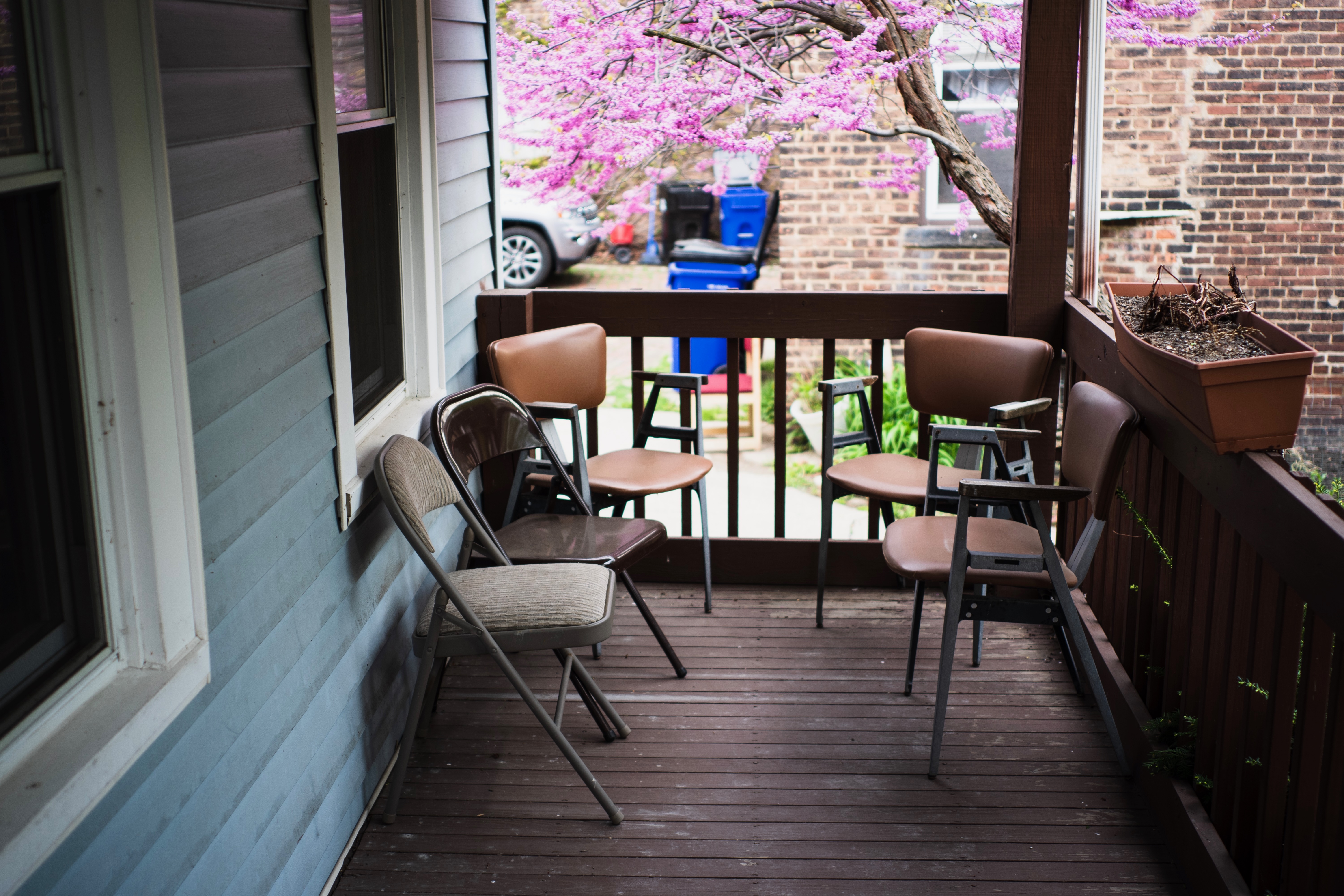 This photograph captures a modest porch adorned with a collection of mismatched chairs, each inviting yet forlorn. The vibrant pink blossoms of a nearby tree contrast against the muted tones of the wooden deck, creating a serene and introspective mood. Soft natural light filters through the scene, enhancing the feeling of tranquility and stillness as if waiting for conversations yet to come.