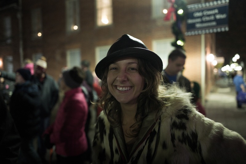 The photograph captures a joyful woman smiling warmly in the foreground, exuding a sense of happiness and camaraderie. She wears a stylish hat and a fluffy coat, standing out against the blurred crowd behind her, which is subtly illuminated by soft streetlights. The overall mood is festive and inviting, with the cool evening air adding a cozy ambiance to the scene.