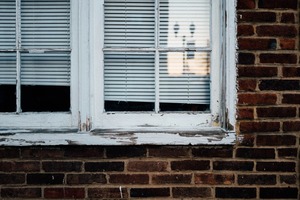 The weathered window sits framed against a textured brick wall, hinting at stories untold. Soft light filters through the slats, casting shadows that evoke a sense of nostalgia and mystery. The contrast between the peeling paint and the clean lines of the blinds enhances the mood, inviting the viewer to ponder what lies beyond the glass.