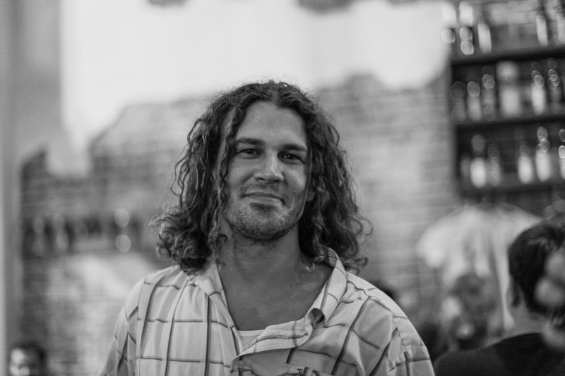 The photograph captures a man with long, curly hair smiling warmly at the camera, embodying a relaxed and inviting atmosphere. Soft lighting complements the rustic backdrop of exposed brick, enhancing the candid, authentic mood of the scene. The black and white treatment adds a timeless quality, drawing attention to the subject's expressive features amidst a blurred, lively environment.