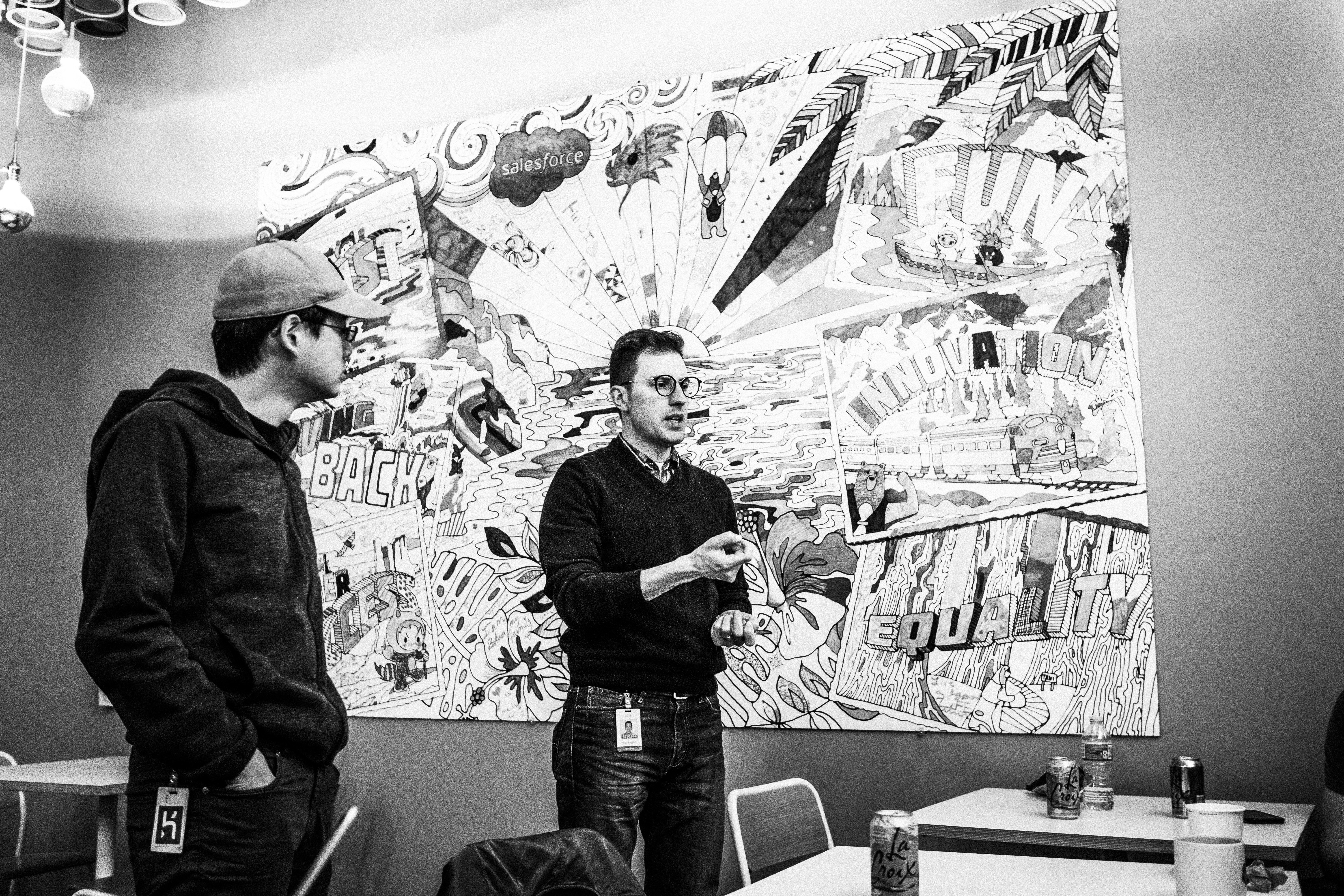 In a vibrant meeting space adorned with an expressive mural, two men engage in a dynamic conversation. The black-and-white tones enhance the serious yet energetic atmosphere, while the pops of color from the artwork and cans on the table hint at creativity and innovation that permeate the room.