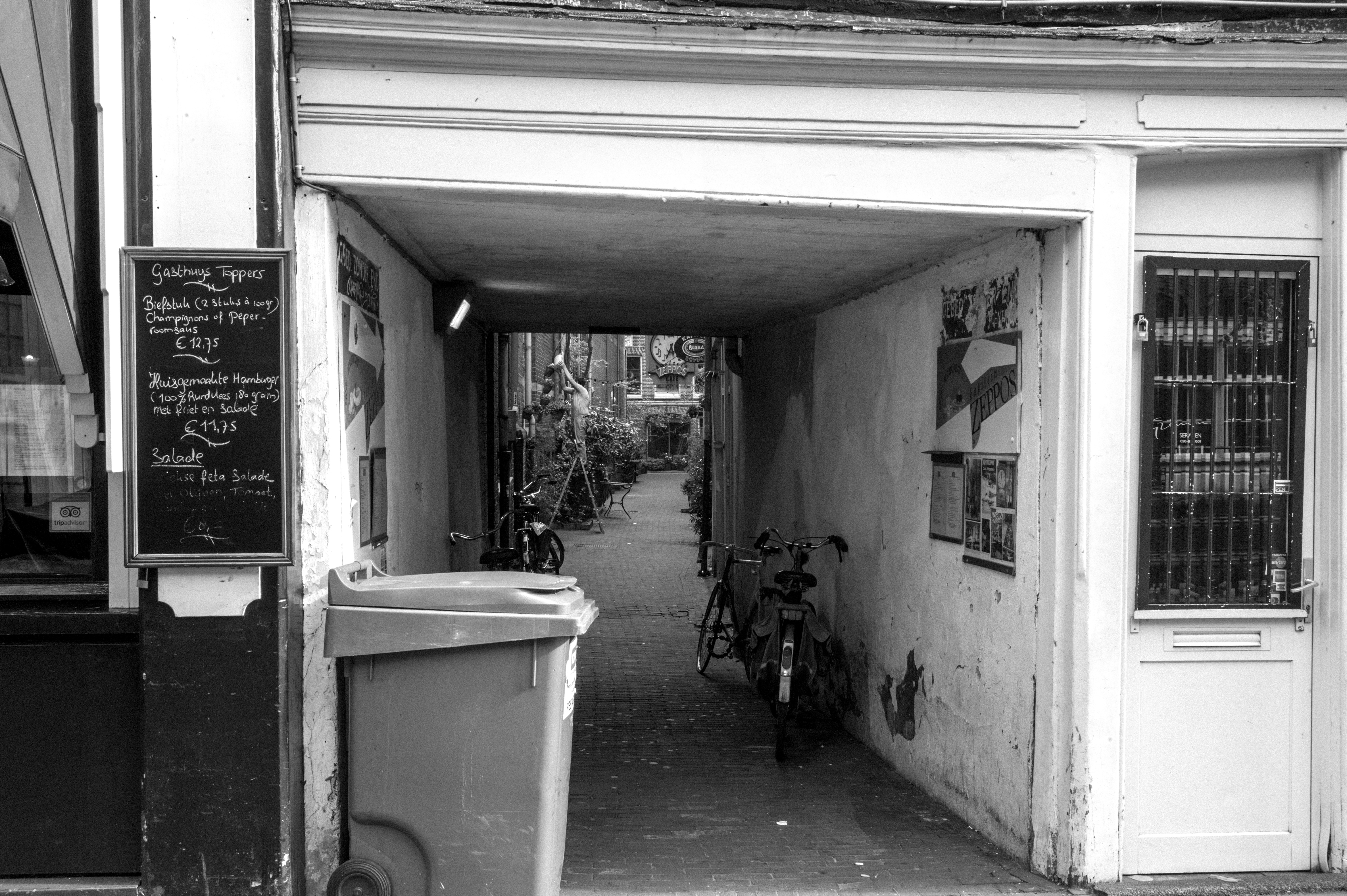 A narrow passageway unfolds, inviting exploration with its soft light filtering through. The contrast of the textured wall against the simplicity of the bicycles and bin evokes a sense of quiet urban life. The monochrome palette adds an air of nostalgia, enhancing the scene's intimate and understated mood.