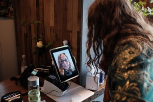 A woman interacts with a digital tablet, her reflection glowing on the screen, capturing a moment of connection. The warm wooden backdrop contrasts with the soft lighting, creating an intimate atmosphere. Surrounded by everyday objects, the scene evokes a blend of technology and personal experience.
