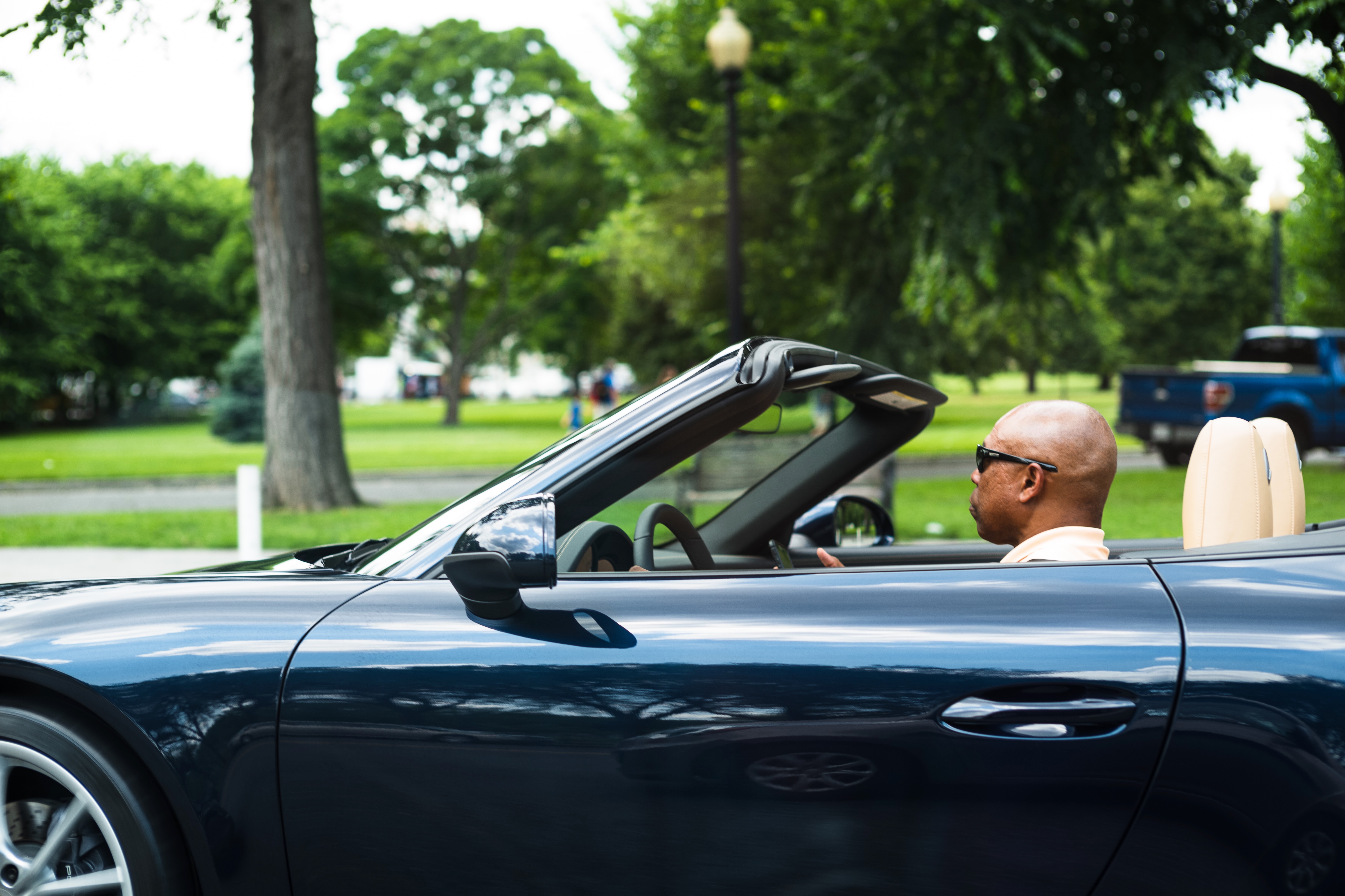 A sleek black convertible catches the eye as it glides past verdant parkland. The driver, donned in shades and a light shirt, exudes an air of leisure and confidence, perfectly at ease in the sunny afternoon. Soft natural light filters through the surrounding trees, enhancing the vibrant yet relaxed atmosphere of this urban scene.