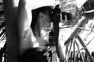 In this striking black and white photograph, a woman is poised with a camera, embodying focus and determination. The interplay of light and shadow highlights her form and the intricate details of her environment, creating a mood of intimacy and artistry. Surrounded by natural elements, her expression and posture suggest a deep connection to both the moment and her craft.