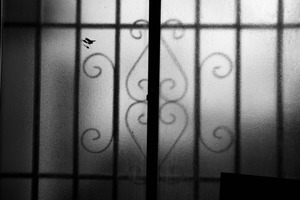 A misty window frames a delicate iron lattice, casting intricate shadows that dance across the surface. The muted monochrome palette evokes a mood of quiet introspection, inviting the viewer to contemplate the unseen world beyond. A lone dark shape, perhaps a bird, flits past, enhancing the sense of fleeting moments captured in stillness.