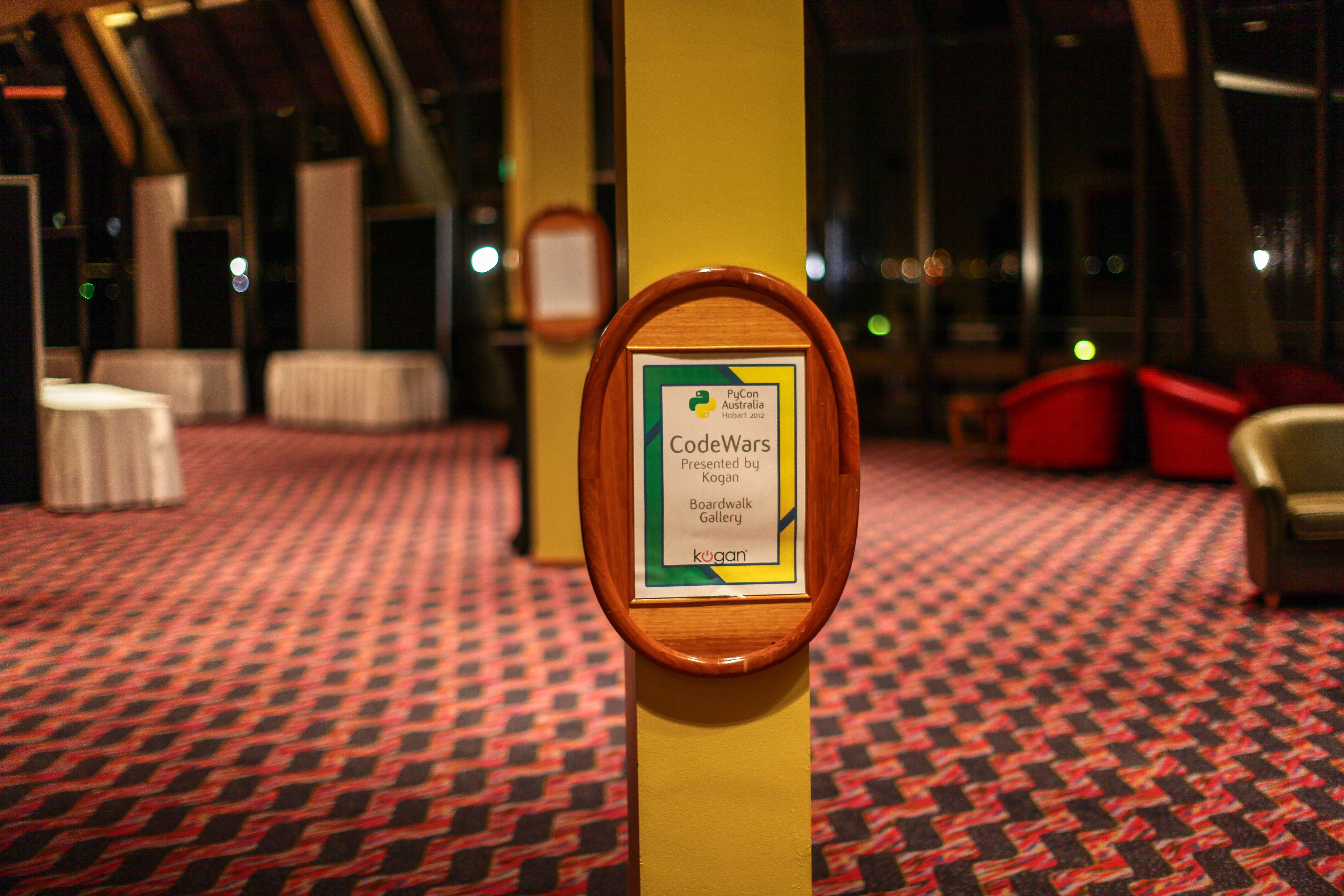 This photograph captures a quiet moment in an empty gallery space, illuminated by soft ambient lighting. The warm hues of the walls and rugs contrast with the dark, glassy windows, creating a cozy yet contemplative atmosphere. A framed sign announces 'CodeWars,' hinting at the anticipation of a forthcoming event amid the serene setting.