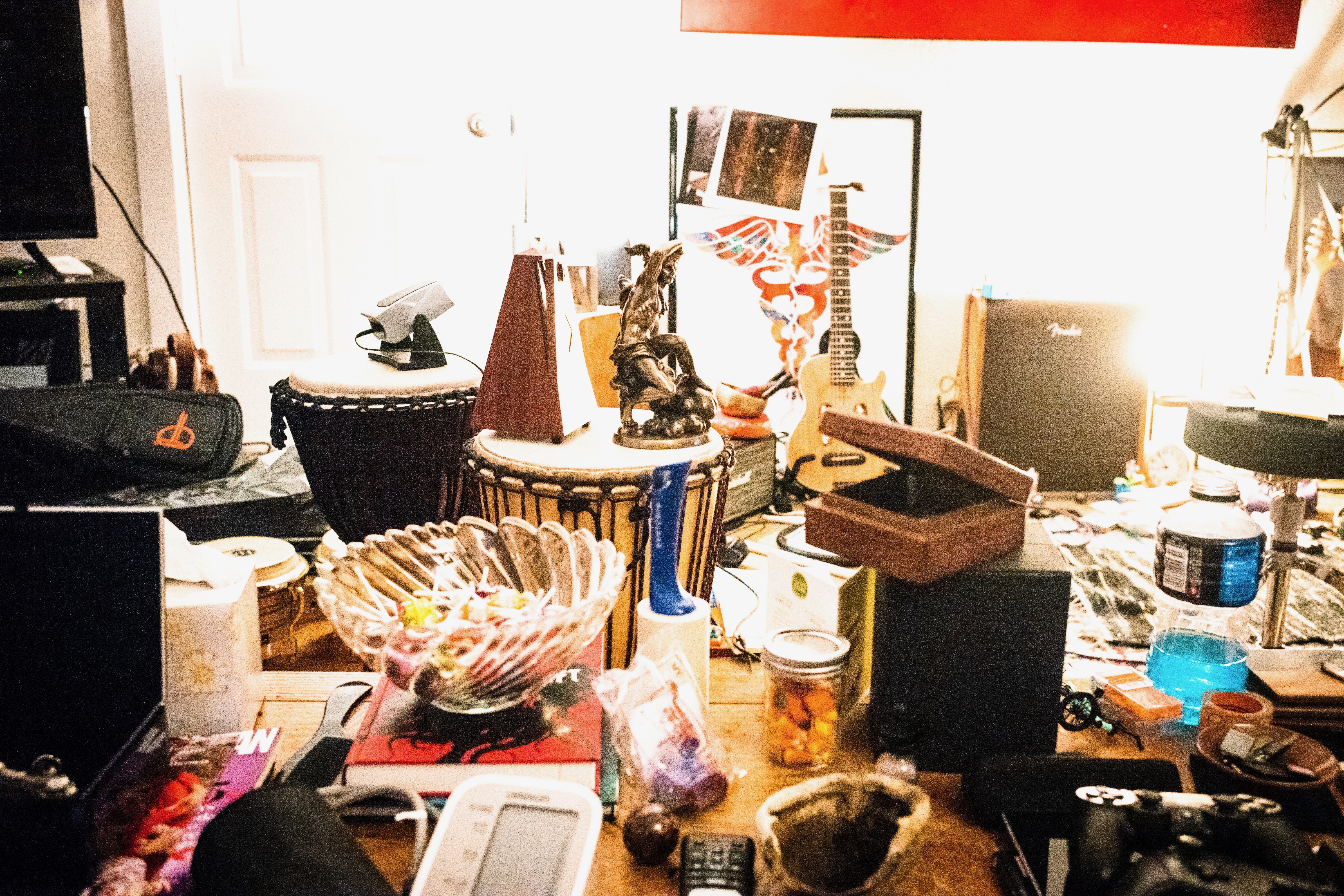 The photograph captures a cluttered workbench filled with various musical instruments, decorative items, and personal belongings, creating a vibrant tapestry of creativity. Soft, warm lighting emanates from the background, casting subtle shadows and enhancing the intimate yet chaotic atmosphere. The composition invites viewers to explore each detail, evoking a sense of curiosity and artistic spontaneity.