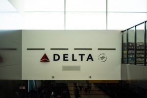 This photograph captures a striking section of an airport terminal, focused on the bold 'DELTA' sign under soft, diffused light. The minimalistic composition emphasizes the sense of departure and anticipation, while the faint silhouettes of travelers in the foreground evoke a mood of movement and transition. The bright window above adds an airy feel, symbolizing openness to new journeys.