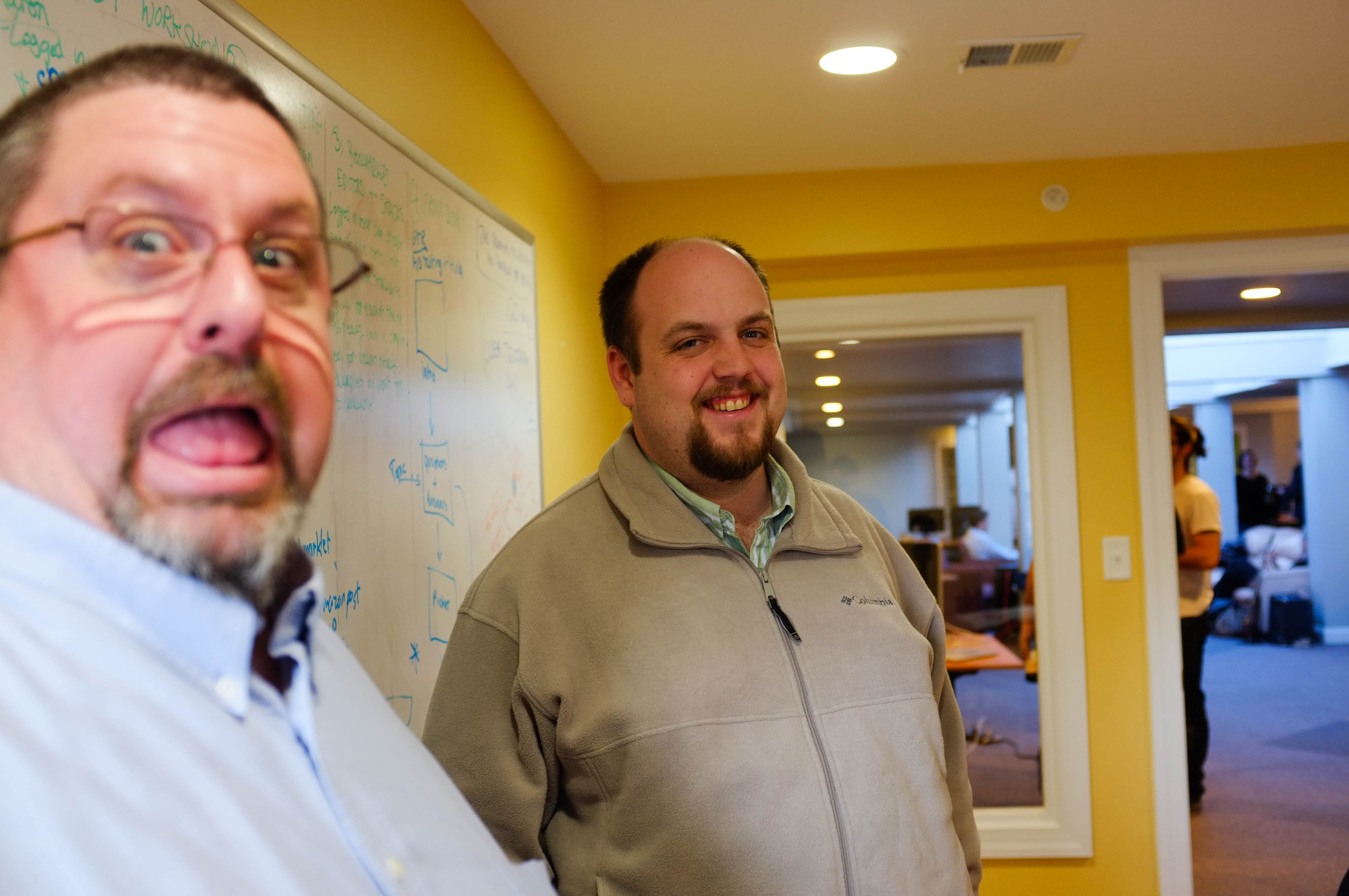In a brightly lit room with cheerful yellow walls, two individuals display contrasting expressions—one exuberantly playful while the other smiles warmly. The mood is lighthearted and informal, suggesting a comfortable camaraderie. The soft, natural light enhances the relaxed atmosphere, drawing attention to the spontaneous interaction between the subjects.