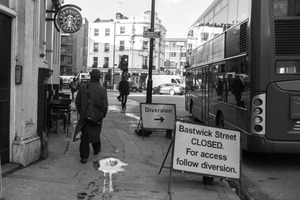 A contemplative scene captures a figure walking along a city sidewalk, wrapped in a coat, with a Starbucks in the background. The stark black and white palette emphasizes the solitude and the slight busyness of urban life, while a diversion sign hints at disruption. Soft daylight filters through the clouds, creating a reflective mood amidst the structured chaos of city life.
