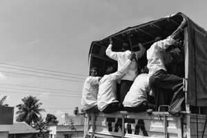 In this monochrome photograph, several men cling to the edge of a truck, their expressions a mix of determination and camaraderie. The strong sunlight casts harsh shadows, highlighting their worn shirts against the bright sky. The composition captures a moment of everyday life, reflecting both the hustle and the community spirit in urban transport.