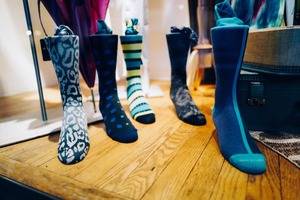 This photograph captures a whimsical display of colorful socks, each uniquely patterned and arranged on a wooden floor that adds warmth to the scene. The play of light creates soft shadows, enhancing the textures and details of the fabrics, while the varied colors evoke a sense of fun and individuality. The composition draws the eye along the row of socks, inviting viewers to appreciate the charm of this everyday accessory.