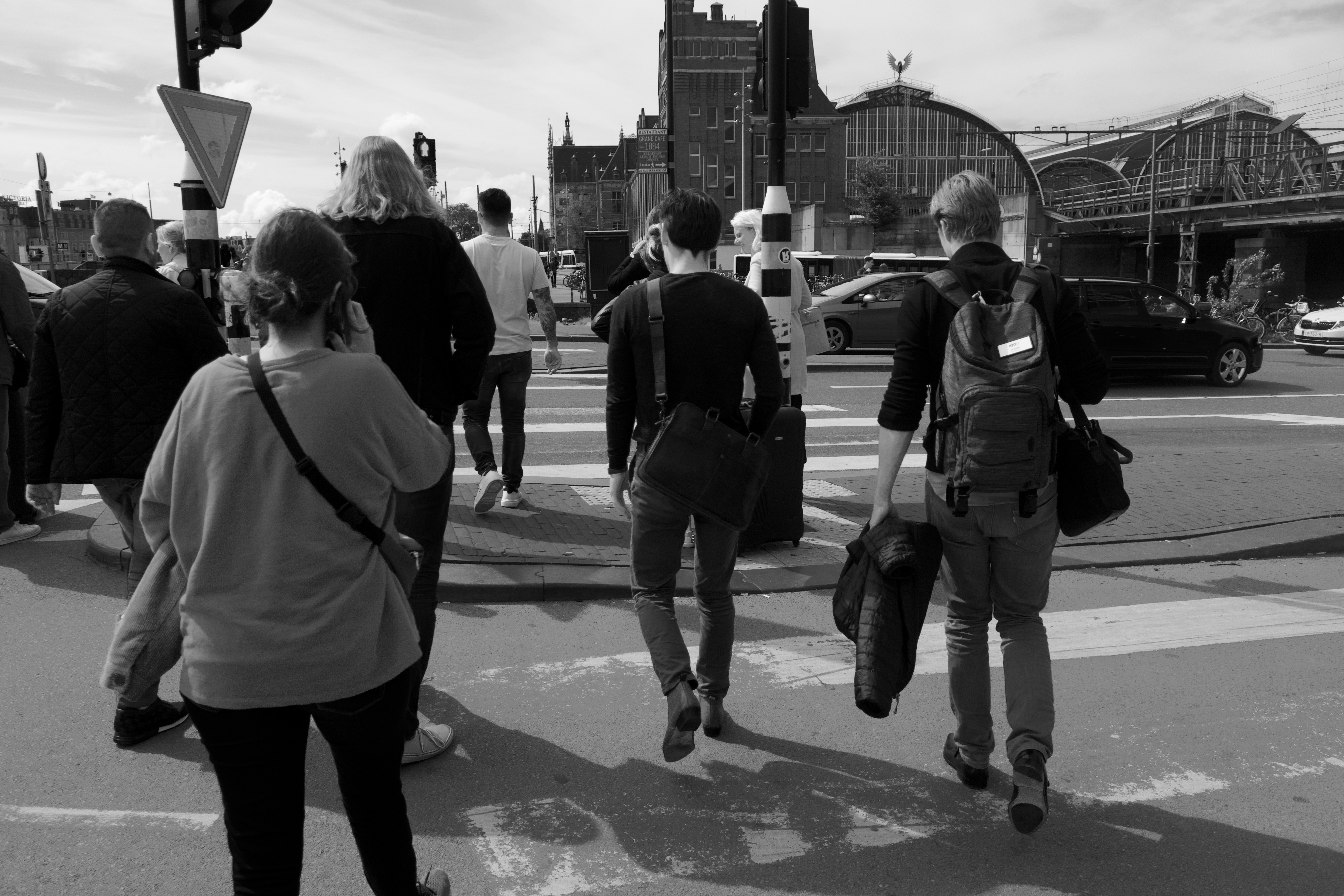 This black-and-white photograph captures a group of pedestrians crossing a busy street, their backs turned toward the camera. The mood is dynamic yet calm, as they navigate the urban landscape under soft, diffuse lighting. The architectural lines of the distant buildings contrast with the figures, creating a sense of movement and purpose in the everyday hustle of city life.