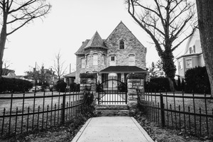 This photograph showcases a large, stone mansion framed by an intricate wrought-iron fence. The black-and-white tones create a moody atmosphere, while the bare trees and sparse surroundings enhance the sense of isolation. The composition directs the viewer's gaze through the gates towards the intriguing architectural details of the house, hinting at stories untold.