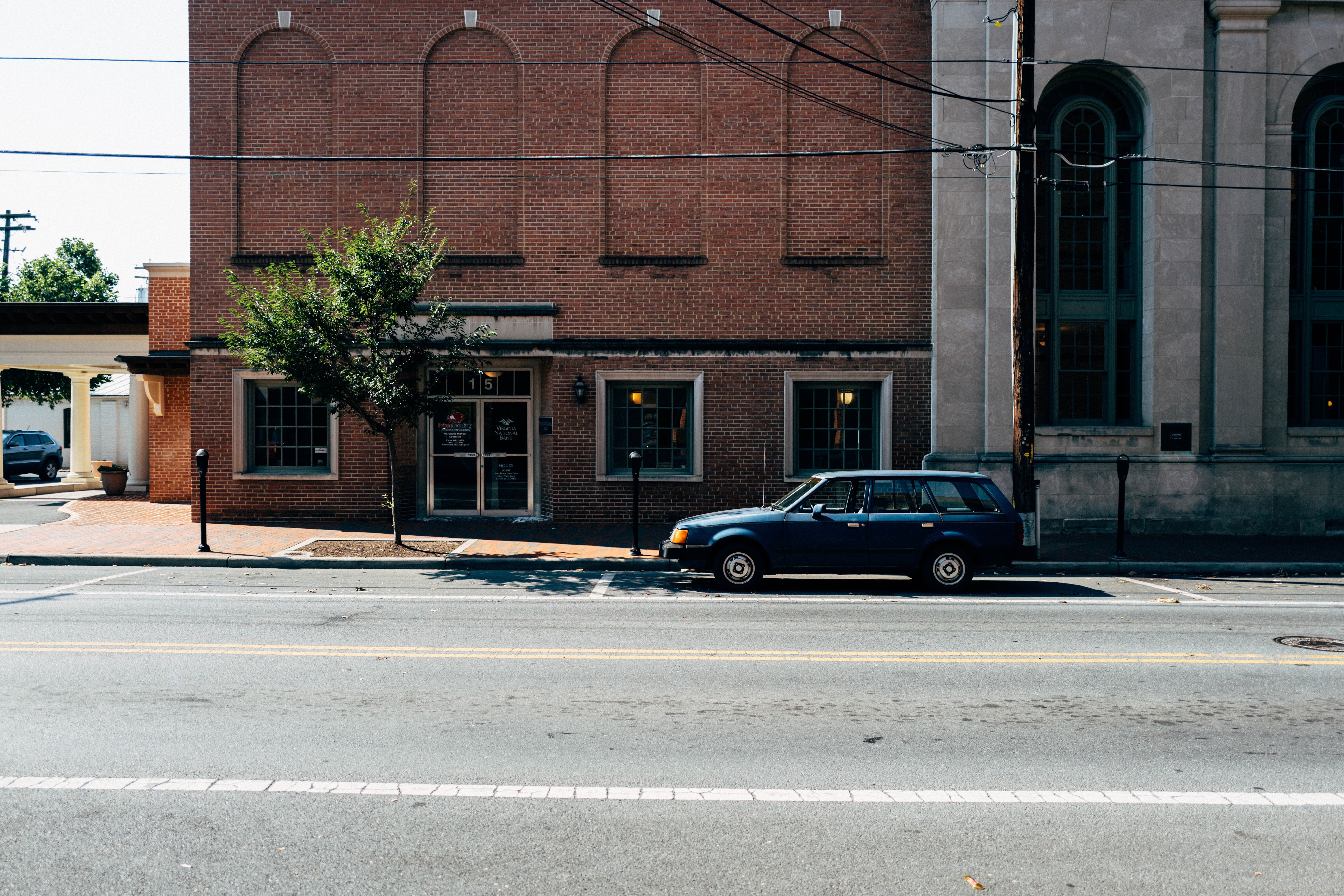 The photograph captures a quiet street scene, highlighting a vintage blue car parked beside a modest brick building. The harsh sunlight casts strong shadows, enhancing the serene yet slightly nostalgic mood of the image. The composition is balanced, with clean lines and a simple color palette that emphasizes the charm of urban life.