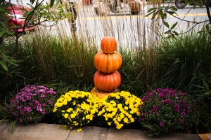 A whimsical stack of pumpkins sits amidst vibrant yellow and purple chrysanthemums, capturing the essence of fall. The soft, natural light illuminates the scene, lending a warm, inviting atmosphere. Surrounding tall grasses gently frame the arrangement, enhancing the composition with a touch of nature's delicate beauty.