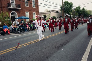 A vibrant parade scene unfolds on a cloudy day, with a marching band dressed in red uniforms marching confidently down the street. The lead performer, in a striking white outfit, embodies joy and enthusiasm, engaging with the captivated crowd lined along the sidewalks. The flag waving in the air and the mix of expressions in the audience amplify the festive atmosphere, contrasting beautifully with the muted sky overhead.