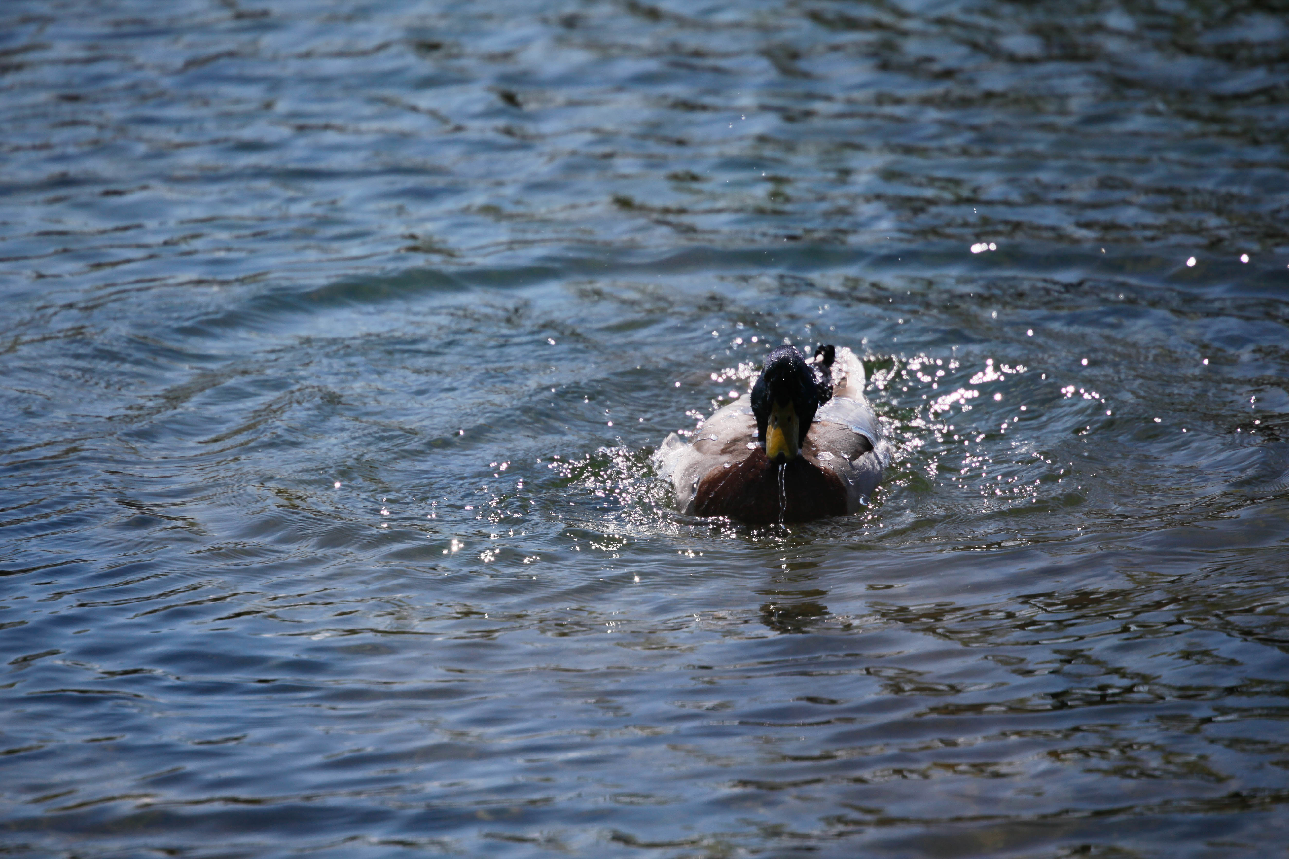 A solitary duck glides through shimmering blue waters, sending gentle ripples across the surface. The sunlight creates a vibrant play of reflections, enhancing the serene mood of the scene. The composition draws the eye towards the duck, emphasizing both its elegance and the peacefulness of its environment.