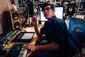 A young man engrossed in his music studio, surrounded by an array of electronic instruments and cozy, warm lighting that creates an intimate atmosphere. His attentive gaze and relaxed posture convey a sense of creativity and focus, while the cluttered workspace reflects the vibrant chaos of artistic inspiration.
