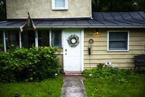 This photograph captures a quaint front door adorned with a leafy wreath, inviting a sense of warmth and home. Lush greenery frames the entrance, hinting at a vibrant life just beyond the threshold. The soft, diffused light adds to the cozy ambiance, creating a peaceful and welcoming atmosphere.