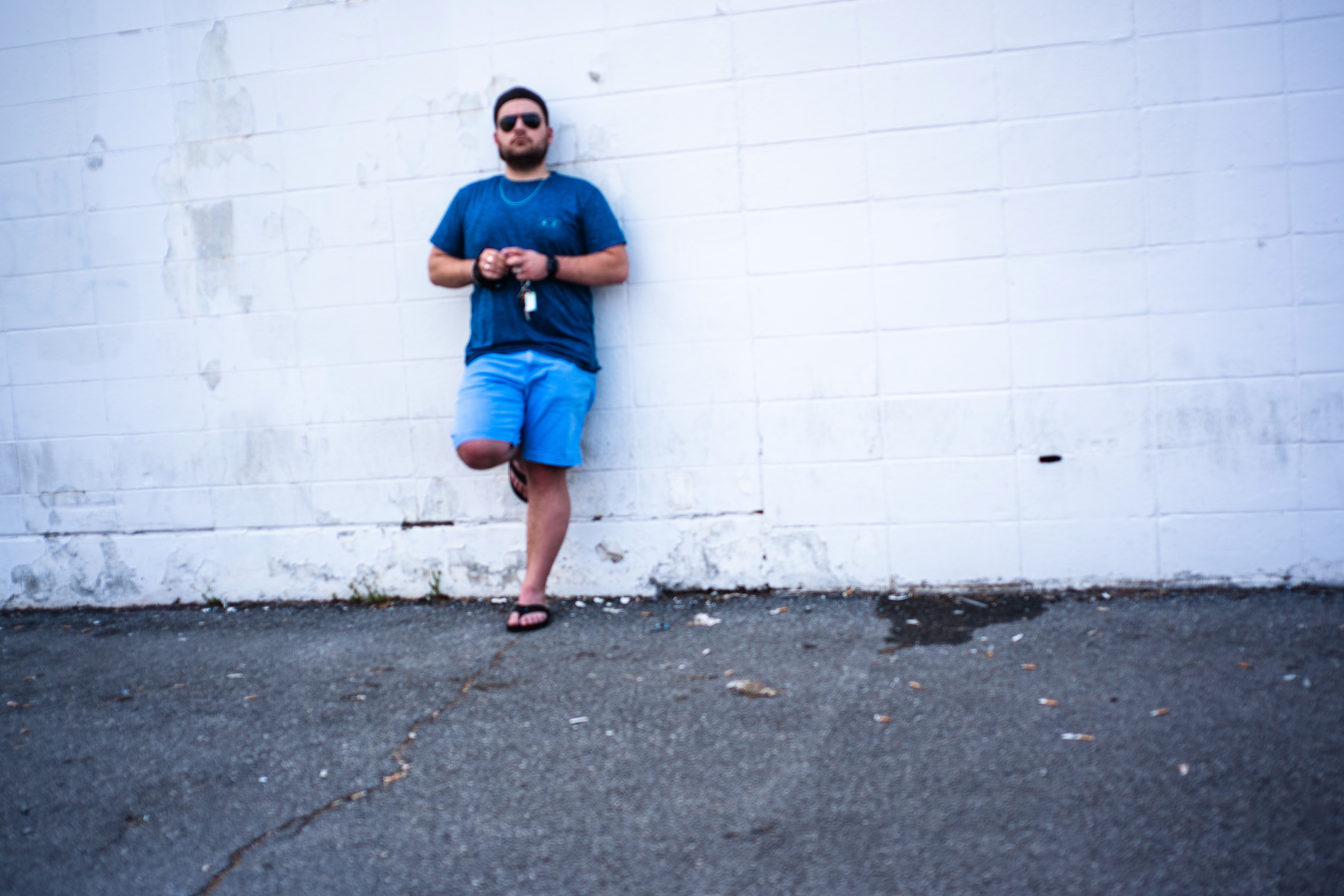 A man leans casually against a stark white wall, exuding a relaxed yet introspective aura. The play of light accentuates the textures of the wall and pavement, creating a contrast that enhances the mood of quiet contemplation. Dressed in casual summer attire, he holds a set of keys, suggesting a moment of pause amidst an urban backdrop.