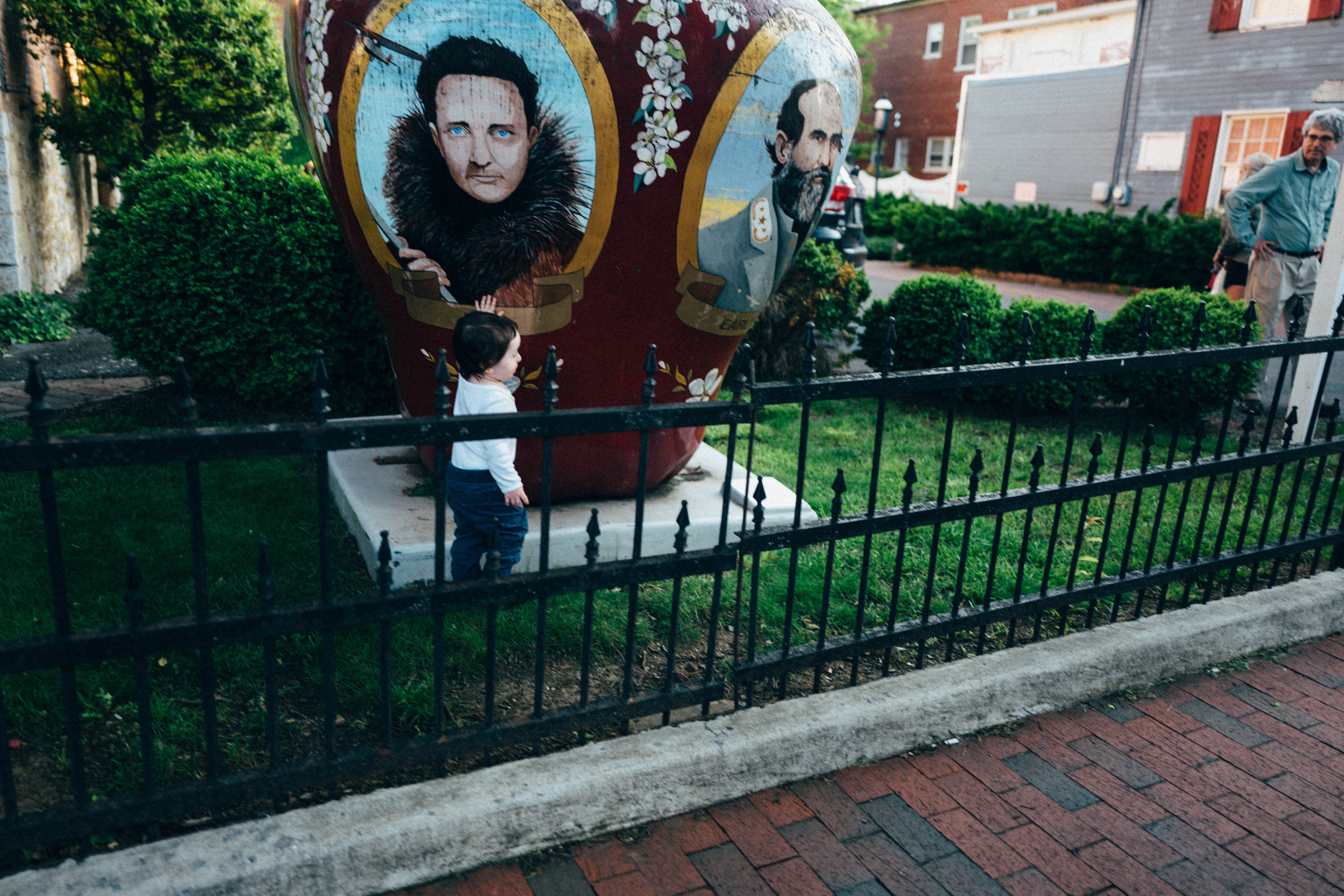 A young child stands in front of a large decorative structure, captivated by the portraits painted on its surface. The warm lighting and vibrant colors contrast with the serene greenery, creating a playful yet introspective mood. The composition draws the eye to the child’s sense of wonder, framed by the black iron fence that encircles the scene.