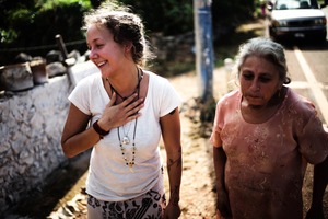 A radiant young woman laughs, her hand over her heart, conveying warmth and joy in a moment of connection. Beside her, an older woman walks with a more subdued expression, hinting at a blend of emotions between generations. The soft, natural light enhances the scene, casting gentle shadows that complement the earthy tone of the surroundings.