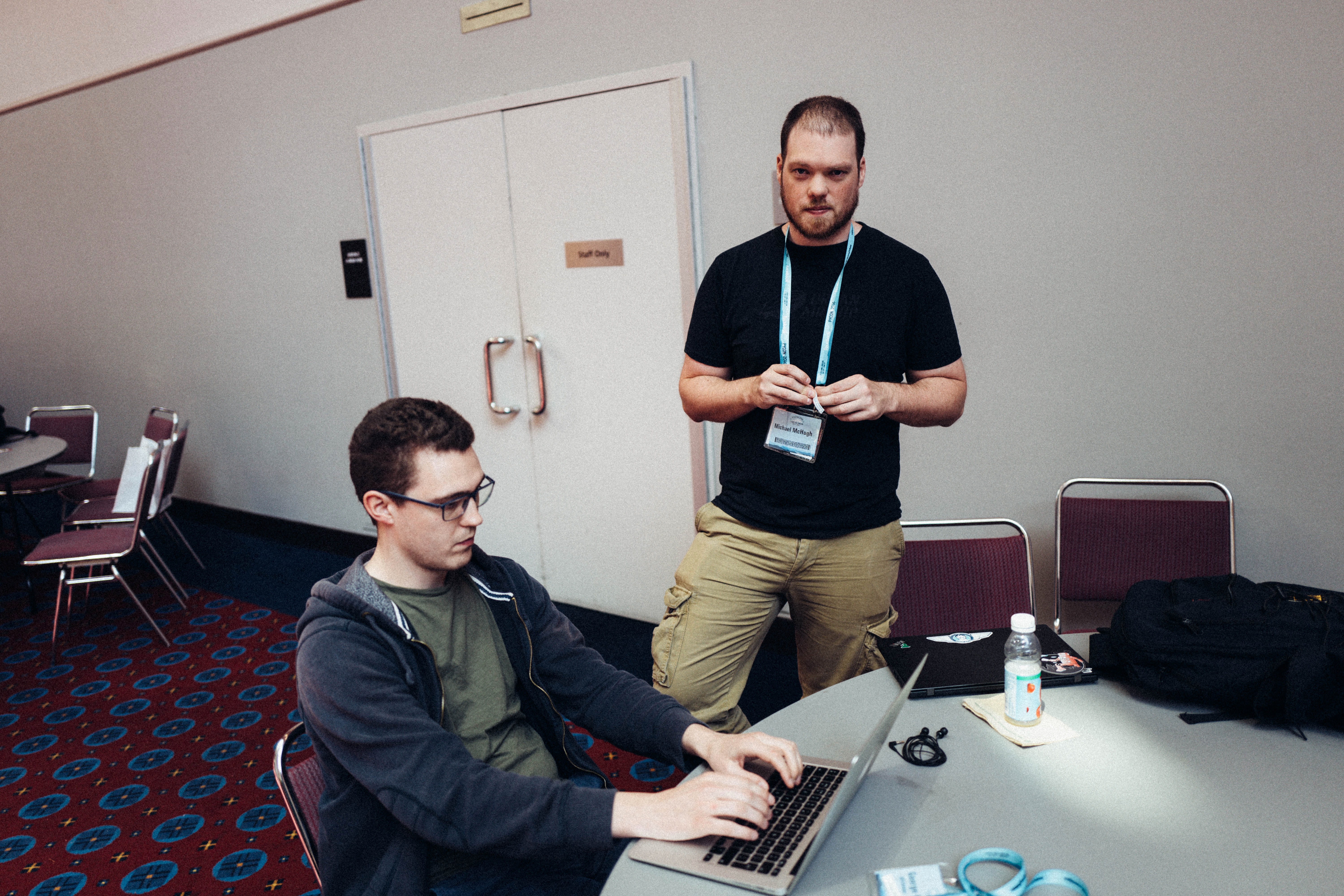 In a bright, spacious room, two individuals embody the spirit of collaboration: one is intently typing on a laptop, while the other stands nearby, engaged and contemplative. The subdued lighting and the muted color palette evoke a sense of productivity, creating an intimate atmosphere where ideas are exchanged. Unobtrusive background elements like chairs and a water bottle hint at a casual yet purposeful setting, perfect for brainstorming or planning.