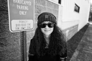 In this striking black-and-white photograph, a young woman stands confidently beside a 'Handicapped Parking' sign, her playful smirk contrasted by the serious message of the warning. The sharp lines and subtle textures of the surroundings enhance her relaxed yet defiant demeanor, while the sunlight casts soft shadows that add depth to the scene. Her oversized sunglasses and knitted beanie give her an air of coolness, blending casual style with a touch of rebellion.