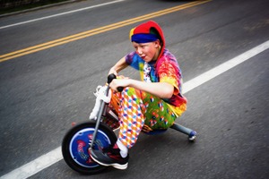 A lively young clown zooms down a street on a small tricycle, wearing a vibrant, multicolored outfit that bursts with playful patterns. The motion blur captures a sense of exhilaration and spontaneity, enhancing the joyful mood of the scene. Bright, natural light reflects off the pavement, creating a lively atmosphere that embodies the carefree spirit of childhood.
