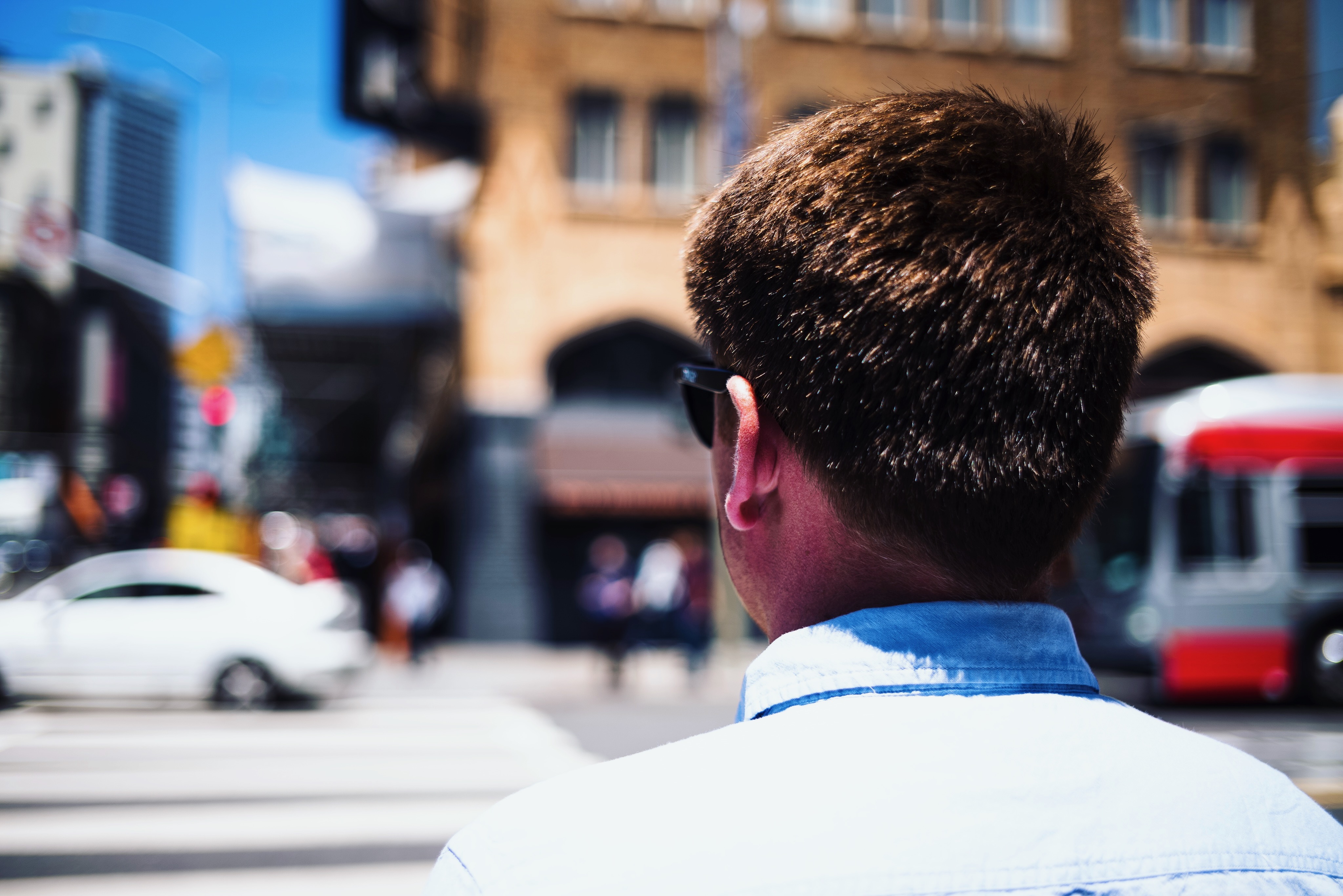 The photograph captures a young man standing on a bustling city street, his back turned to the viewer. The bright sunlight bathes the scene in warmth, creating a vibrant contrast against the muted tones of the buildings in the background. The composition emphasizes the man's contemplative stance amidst the urban chaos, inviting a sense of introspection and curiosity.