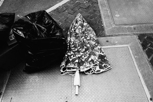 In a stark black and white composition, a vibrant floral-patterned umbrella lies abandoned beside two large black trash bags. The juxtaposition of the lively umbrella against the grimy refuse evokes a sense of solitude and neglect, capturing a fleeting moment in urban life. The low, diffused light accentuates the textures of the pavement and the contrasting materials, imbuing the scene with a poignant, melancholic mood.