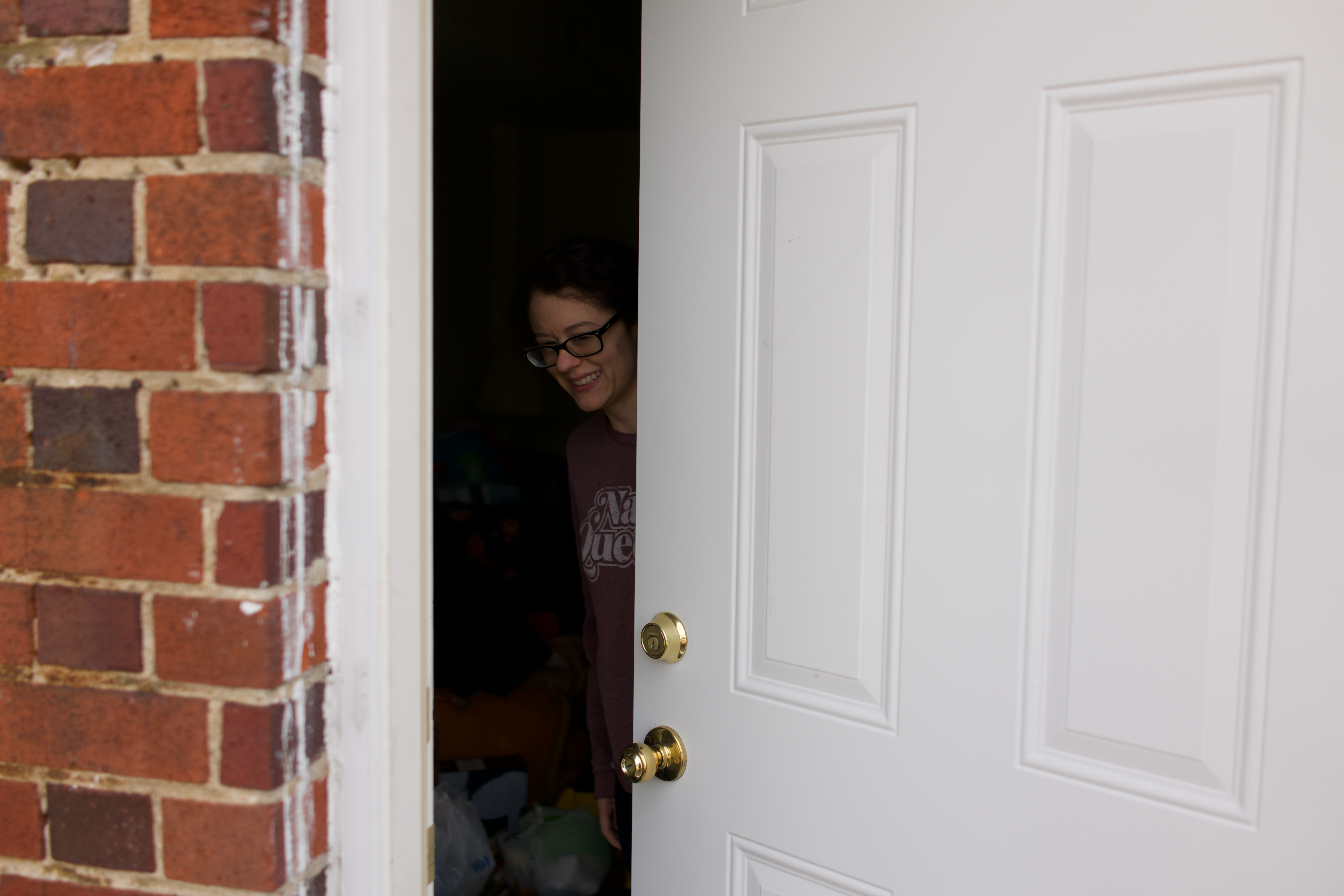 In this intimate shot, a young woman peeks through the slightly open door, her expression brightening the moment with a gentle smile. The soft natural light filters in, contrasting with the darker interior, creating a welcoming yet mysterious atmosphere. The brick exterior adds a rustic charm, framing her as she stands on the threshold between the outside world and the coziness within.
