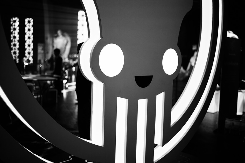 In this playful black-and-white photograph, a cheerful squid figure stands illuminated against a darkened background, drawing the viewer's focus. The soft glow accentuates its rounded features and oversized eyes, evoking a sense of whimsy and joy. Subtle shadows create depth, while blurred figures hint at a lively atmosphere beyond the central subject.