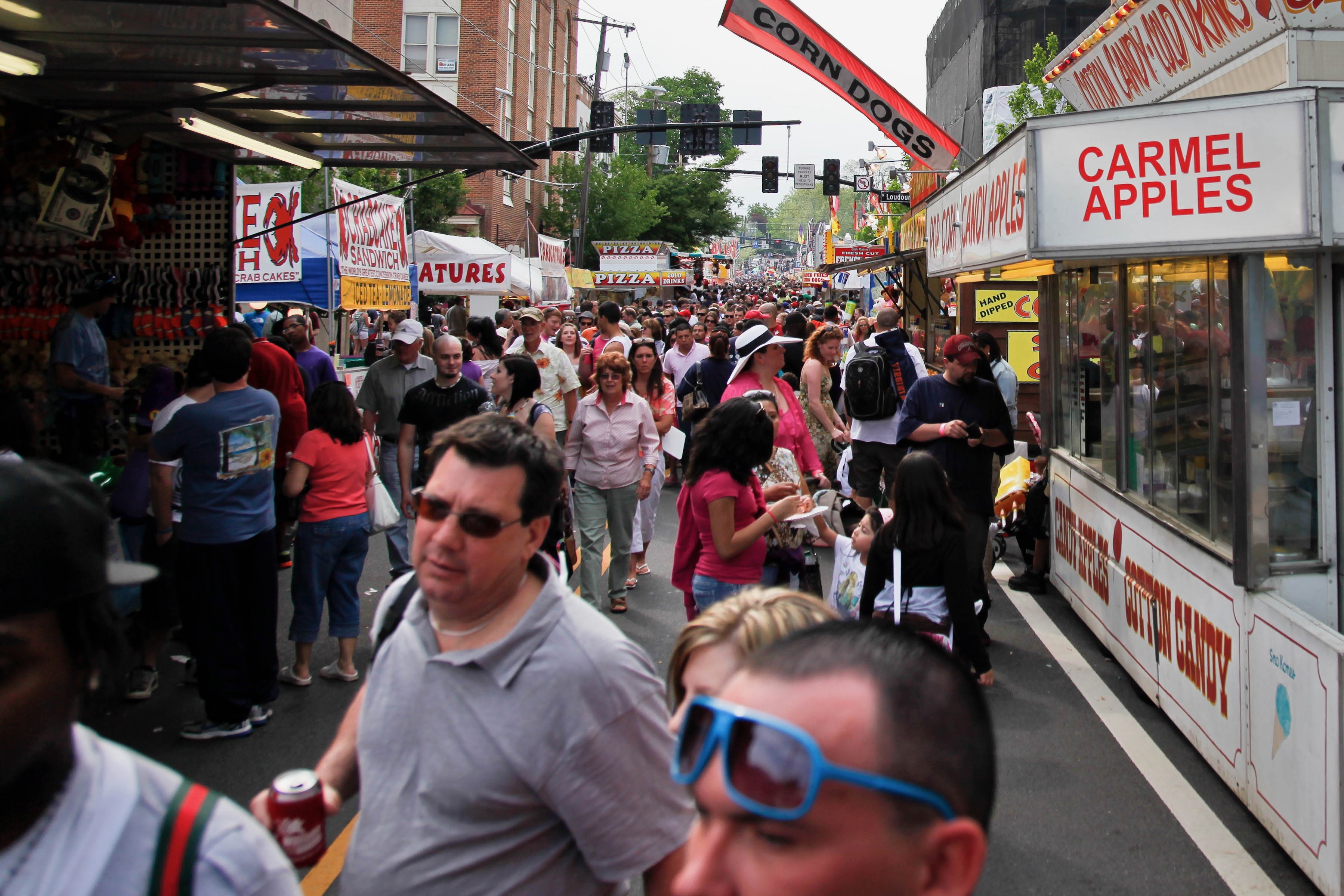 A bustling street fair comes alive with a colorful array of food stalls lining both sides, each showcasing tempting treats like corn dogs and caramel apples. The lively crowd, filled with families and friends, creates a sense of joy and community, while the midday lighting casts a warm glow, enhancing the vibrant atmosphere. The composition draws the eye down the busy thoroughfare, inviting viewers to immerse themselves in the festive experience.